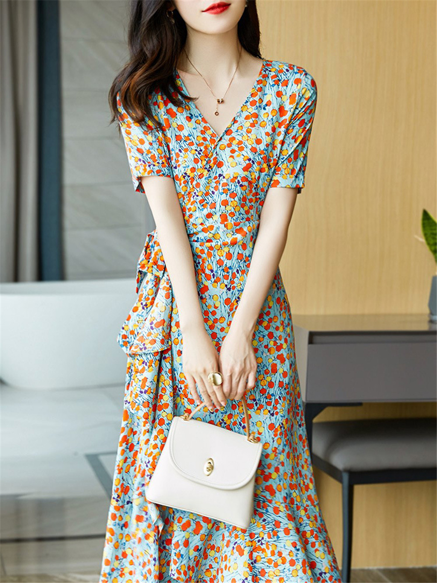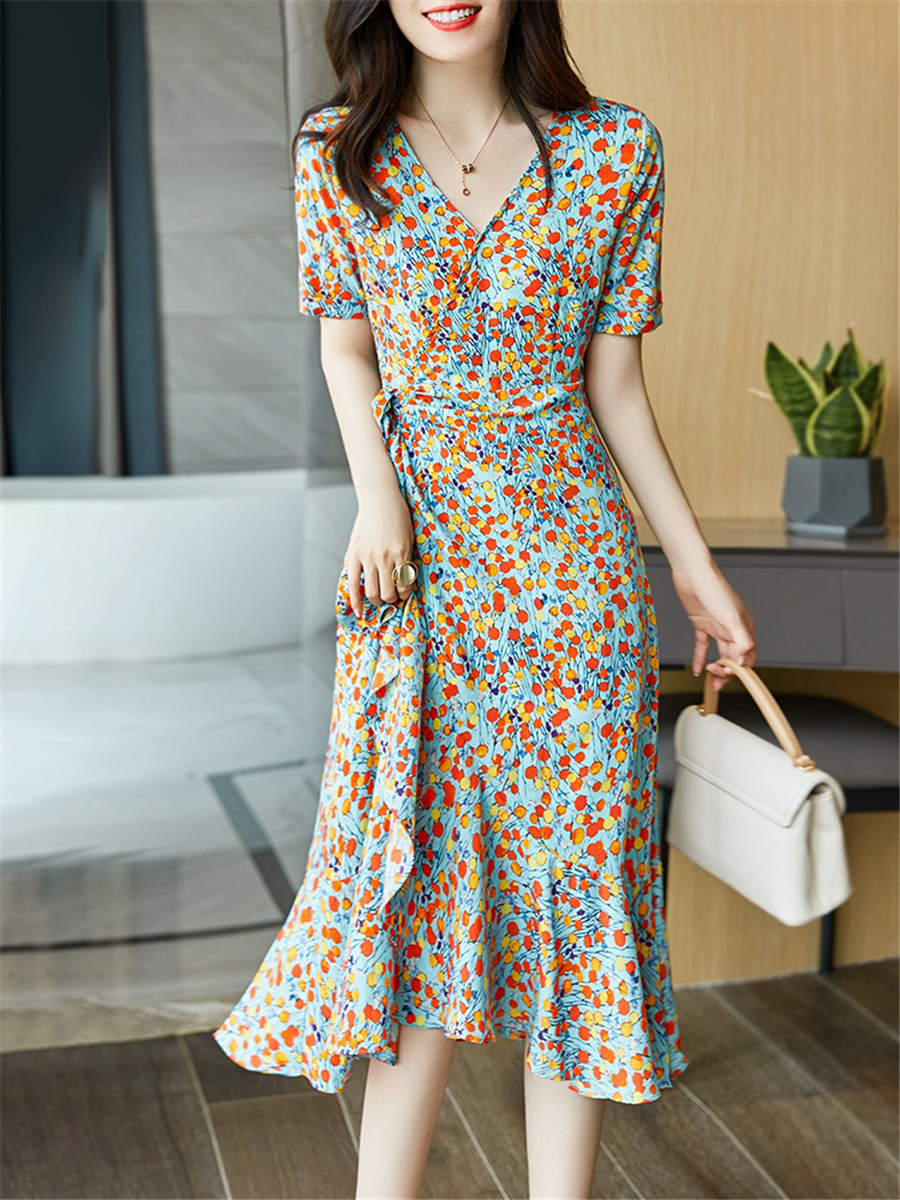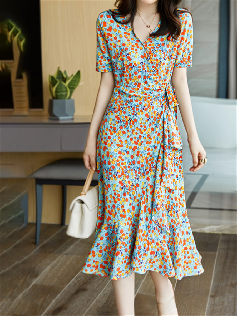 法式风情v领碎花收腰显瘦气质荷叶边不规则连衣裙子女2021年夏季