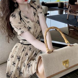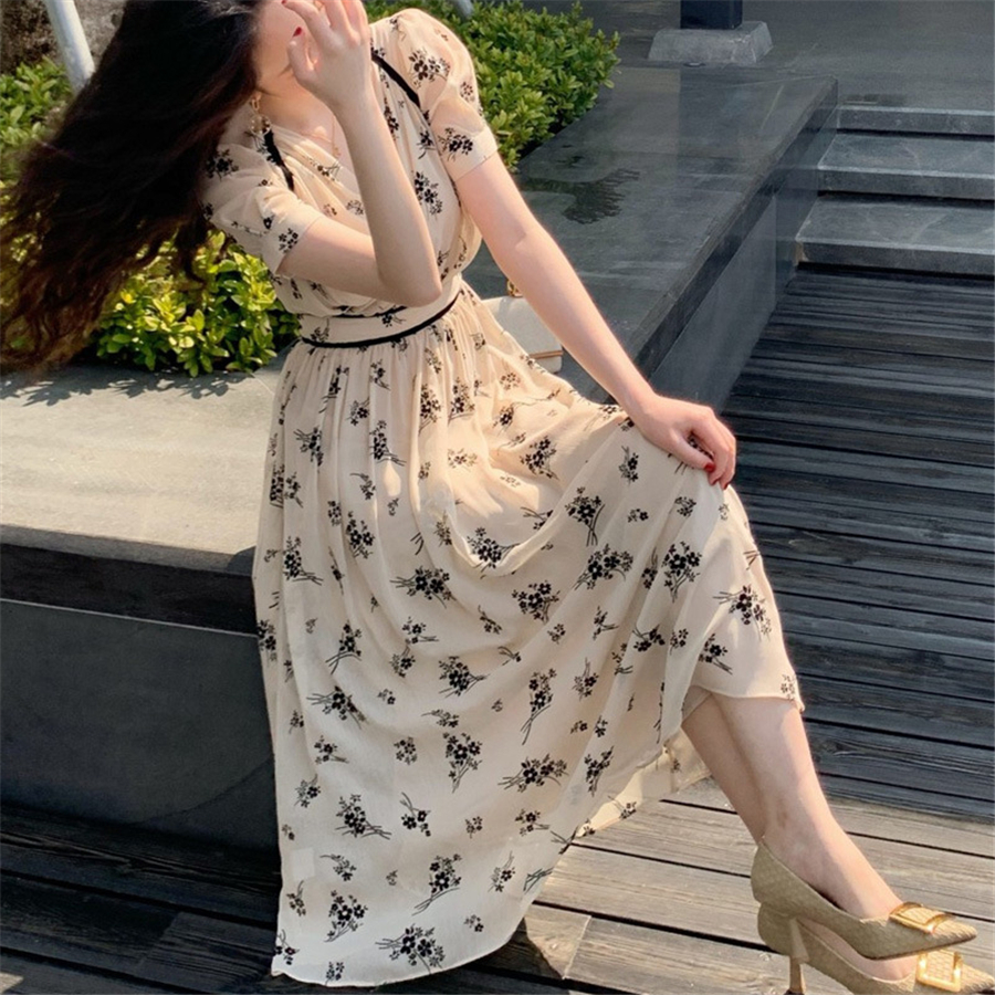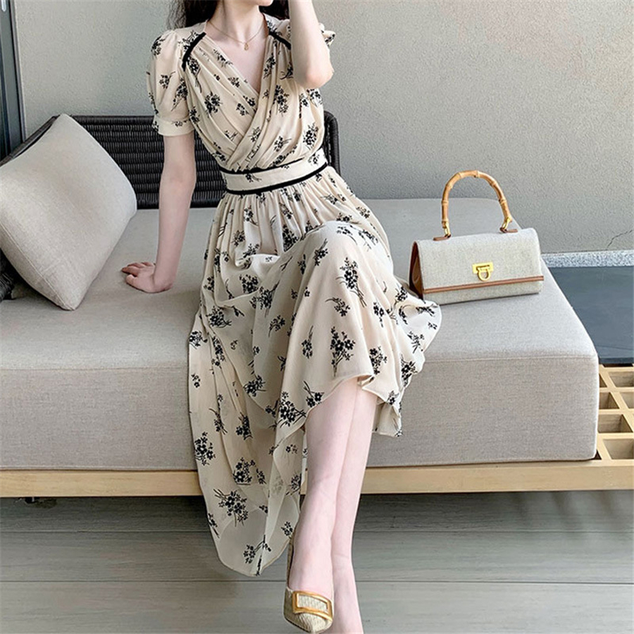 法式复古优雅气质宫廷风收腰显瘦飘逸雪纺V领印花连衣裙子女夏季