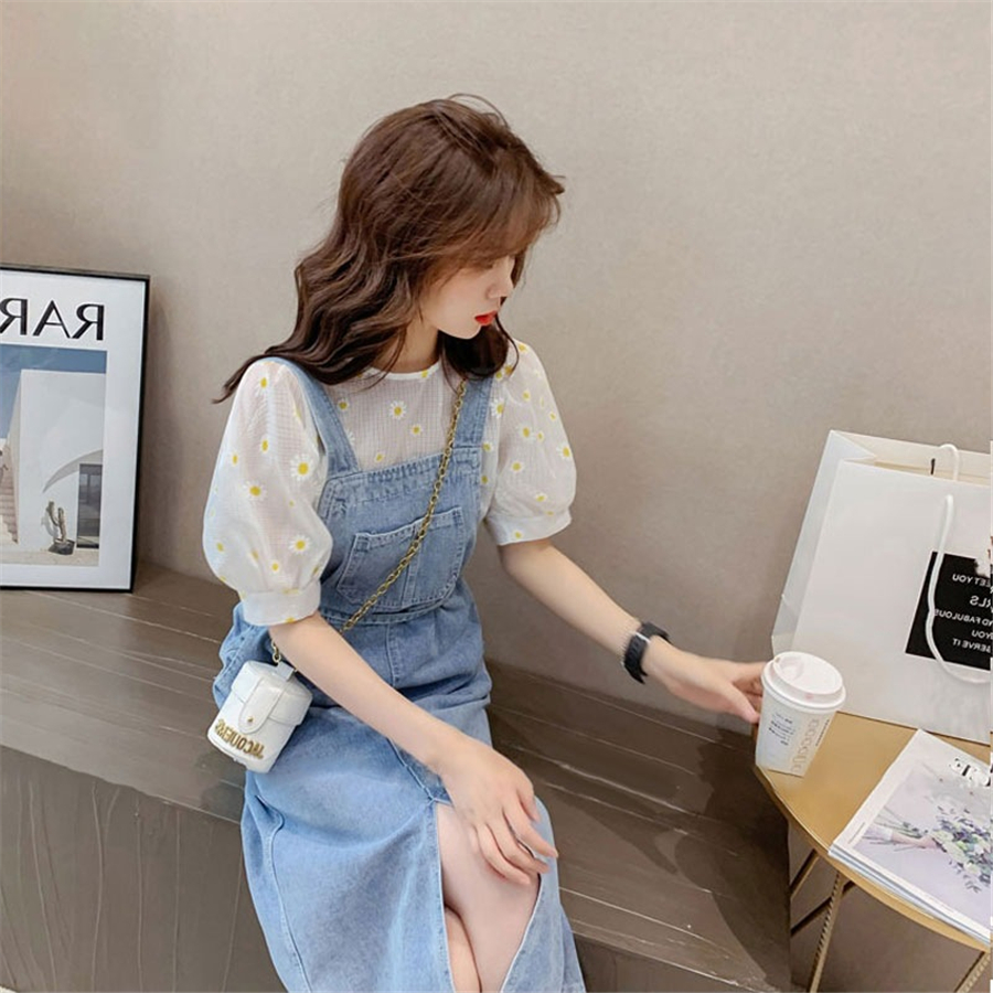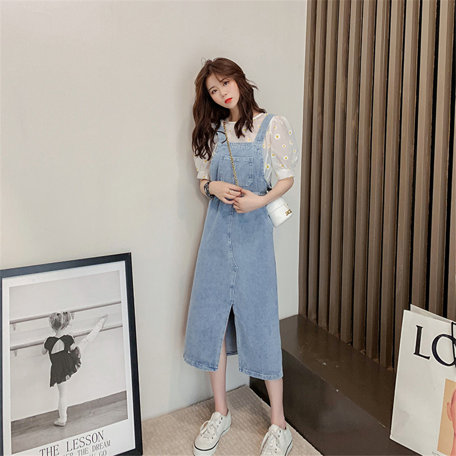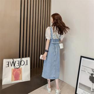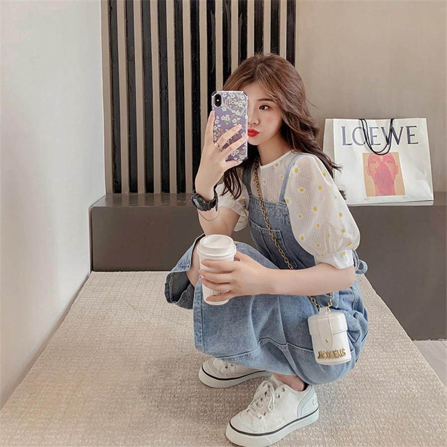2021年夏季新款法式初恋甜美小个子宽松牛仔背带连衣裙子两件套装